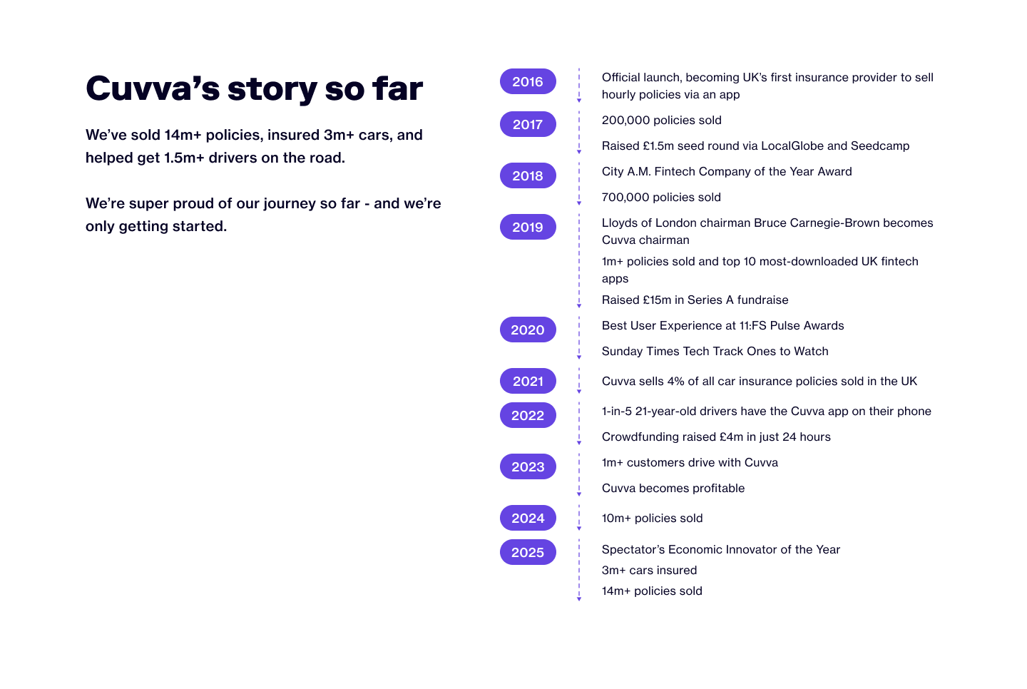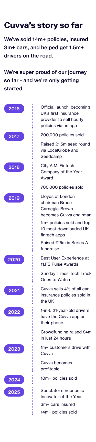 Cuvva introduced temporary car insurance via an app in the UK, so people can get insured for a short time. Since selling our first temporary car insurance policy in 2015, we've been helping people get on the road, on their terms, faster for less. Just ask our 1.5 million+ customers.